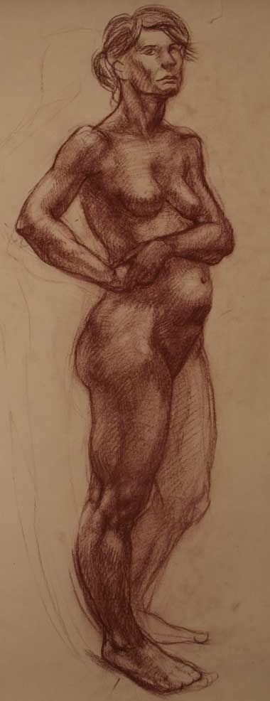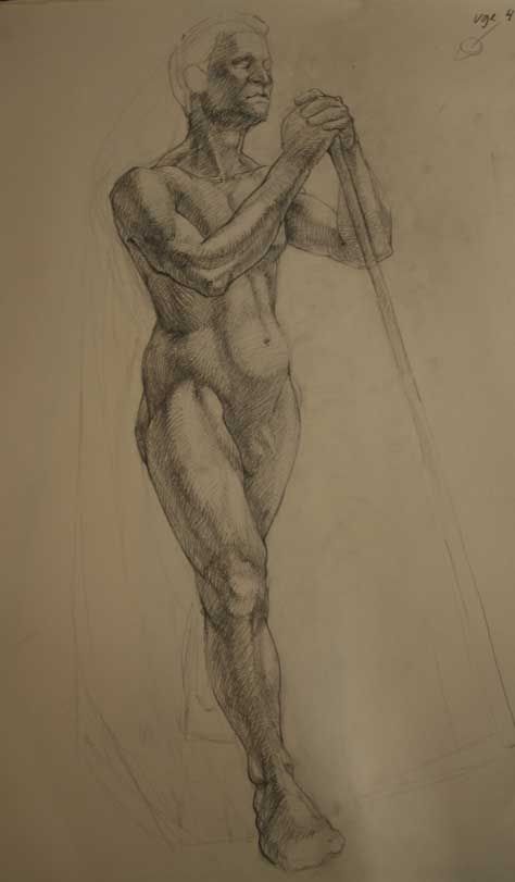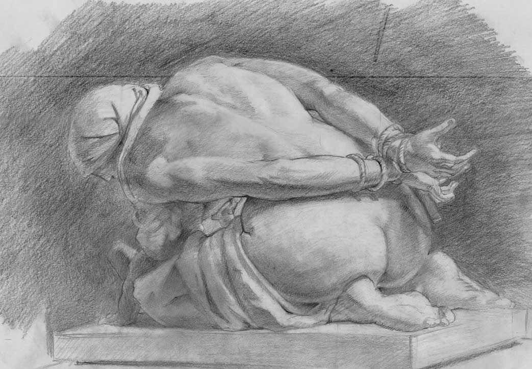 A few minor weak points - the hands seem a touch small, but without the original it’s hard to know. Would love to see a bit more turn in the transition from the upper to the lower arm. Would also love to see you work a bit on the consistency of the shading. You might try experimenting by drawing on good quality, toned paper, with black charcoal with a white charcoal or conte / nupastel for highlights as finishing touches.