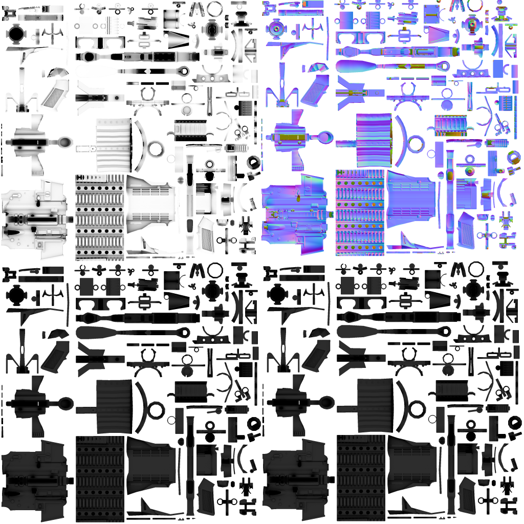 The inclusion of the ao and normal in GLSL fig 4 enhances the shading qualities of the M4 I think - a baked colour or Diffuse map plus Full Render were also created for future use.