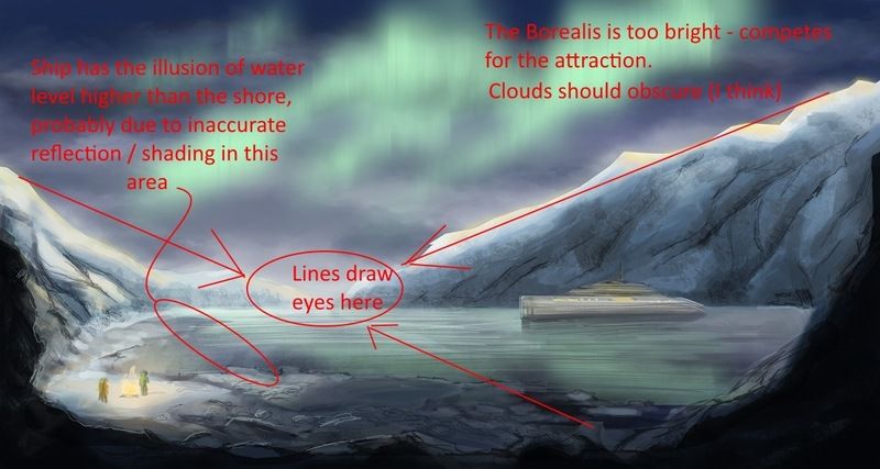 The story is basically a few (hobby-)scientists went to the arctic to do research.After a long day they are siting by a camp fire watching the northern lights. The first focal point should be the camp fire. The second one should be the yacht/research vessel that is anchored at the bay (their “home” - cozy atmosphere)…