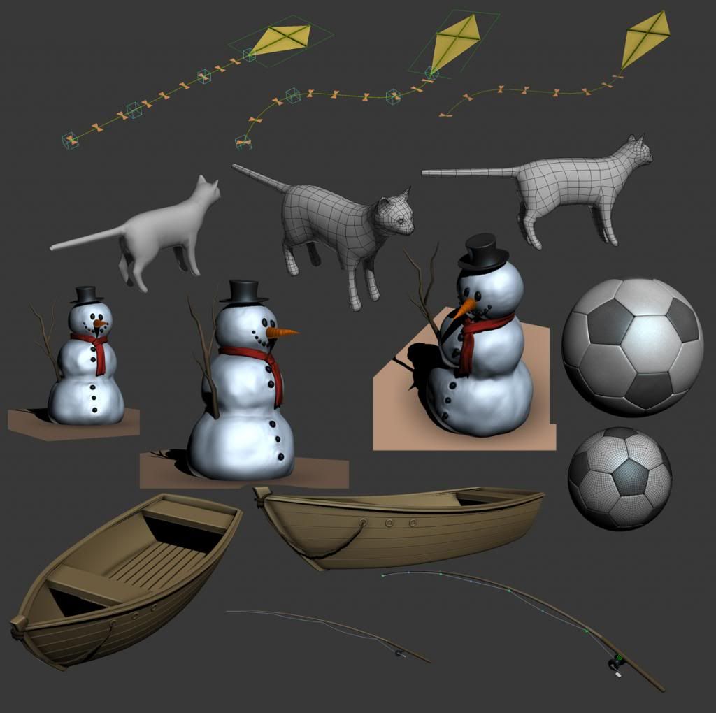 Another speed modeling session. Some speed low-poly meshes here. Kite and Fishing Rod with a basic animation setup. Snowman is a quick sculpt in ZBrush.