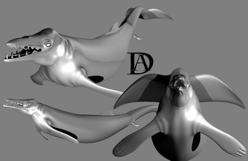 Despite the name this is not a Dinosaur but a primitive cetacean.( mistaken identity upon discovery ended up sticking with it) (whale) From about 30 million years ago. Anyways I am roughing out the shape and wanted to show you my workspace. If you look closly the artists interpretations are diferent for this so even if you are doing an existing creature you have some leeway as far as how to construct it. One pic has a dorsal fin the other does not.