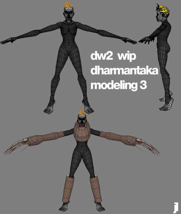 as for the modeling process: nothing to report really but i was working out kinks the time i got to work today. shaped legs & arms but i don’t think i’m sticking too close to the concept art. maybe shin guards & maybe gloves that arn’t just giant bowling balls & extend further up the arm. also i was playing with the idea of adding cords out the back of her armor. no reason really. just as sort of a neat peripheral motion sort of thing. they had sensor sort of bulbs at the end.