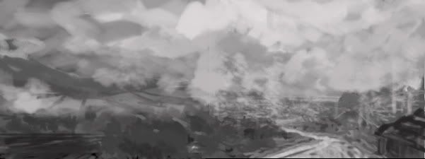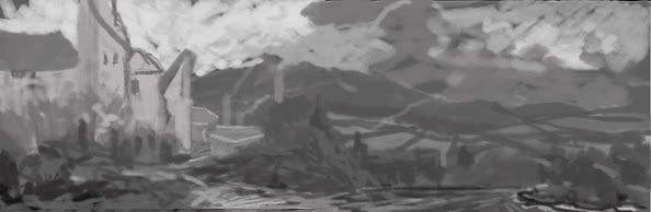 Mu > Youāve got the basics of the instruction right. now try to compose those elements not as lines but as solid greyscale shapes. The instruction for this theme is mroe freeform, allowing you to paint any kind of enviroment to include some rural and industrial elements combined with some steam punk machinery if youāre up for it