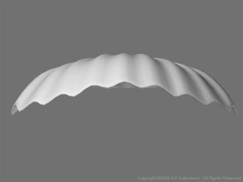 Process: Many shapes extruded along bezier-created paths to create forms, with shapes duplicated along the same paths to create spikes and other jutting pieces. The only exceptions to the rule are the spikes directly on either side of the seat, which had to be hand positioned and reshaped due to post-extrusion altering of the basic seat shape, and the three spikes directly behind the seat, which had to be hand-positioned after joining the left and right side lower support forms together after extrusion (see below).
