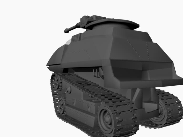I was actually modeling this w/out even knowing about the challenge , its mostly done , still trying to tweak the treads to make them animate-able so if anyone has any good tips for doing so please share , I did have to do a little customization on it in the cockpit area , due to the severe lack of detail on the toy pics i used for references (this one actually has controls as opposed to the little plastic armrests on the toy) other customization was in the suspension area as it was non-existant on the toy as well. So far I have probably about a solid 5-6 days invested in it of actual modeling time and about ten times that tryin to find an efficient way to rig the treads. here are some pics of the mostly complete model, try to excuse the awful textures as i kinda suck in that dept.
