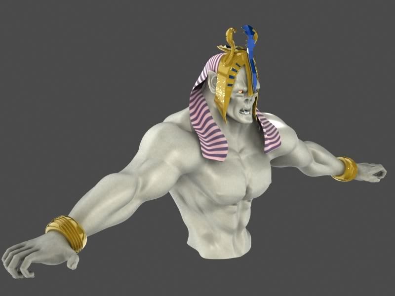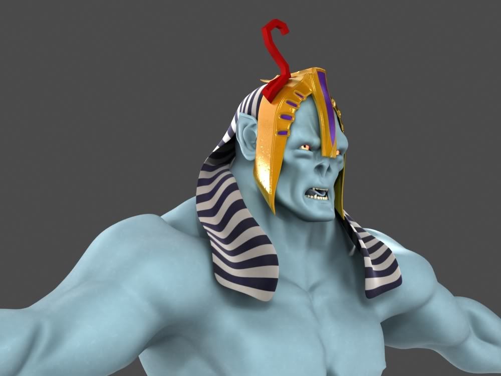 There’s something about the headpiece that’s bothering me though. The modeling is great and I cant quite put a finger on it. Is it going to extend furhter back? Perhaps its the lack of depth, which would make it difficult to “hold” on to the head. I’ll let you know once I can pinpiont it. Also that bump looks rather heavy, if you ask me, while the cloth texture looks very nice. The cobras look great, btw. For some reason I really like modeling on the teeth & gums. lol Very well done!
