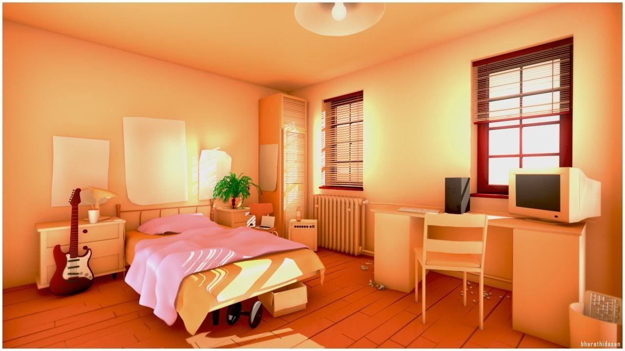 GecT - Great start! You have nice levels of sunlight and sky fill. Try adding more color, warmer yellow to the sun, cooler blue (or at least some pink or purple) for the sky? I like the translucency of the chair. The plant leaves and poster paper could also use some translucency. Even if the leaves and paper arenāt transparent (you canāt see through them), they should be translucent in the sense that light hitting the front of these surfaces makes the back side brighter, and they should cast shadows that are lighter than the shadows an opaque object would cast. I think the fill light could use more variety, getting brighter near the window on the right, and diminishing in intensity before the left corner. Some warm bounce light coming up from the bed onto nearby surfaces would also add richness and variety to the scene.