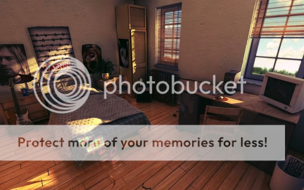 mk3d-cz(MTV suicide series) - Great work! I love the texturing. The floor with the different color highlights is terrific. I think you could push the image a little more out of balance. Maybe the left side with the lamp could get brighter, with more bounce light from the area lit by the lamp bouncing up and around the left side? Or a translucent red lampshade casting some warm light up there? The balance might be broken a bit by rotating the camera off-kilter too. Maybe a little more white light mixed with the blue in the window, but more warm light on the left, could give a punchy image while maintaining contrast between a bright left side and mostly-dark right side?