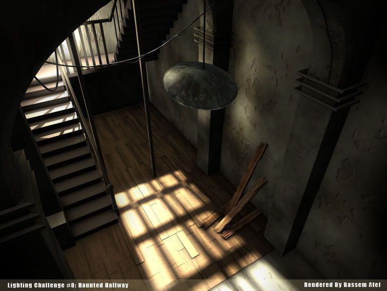On the issue of whether a scene looks “haunted” – I used the name “haunted hallway” because I thought it was a catchy title for the challenge, that’s all. There is no rule you have to take the title as a literal requirement. As I recall Gary Tonge’s original concept art had a haunting, etherial feeling (although I saw it several months ago, I don’t know if it’s still on the web somewhere?) as does Dan Wade’s rendering that I posted on the first page. The models certainly look like a good “haunted house” type set to me. If you wanted to develop a new render based on this scene, and wanted to make sure that it was haunted in a “spooky” or “creepy” sense, then perhaps a good place to start would be doing some research by renting DVDs that have scenes you thought looked really spooky and grabbing some frames to study as reference or use for inspiration on issues of lighting and color and contrast and shadows.