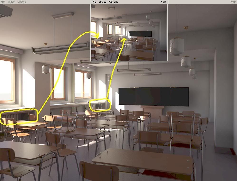 I rendered this image form an earlier slightly different stage of the scene. The most noticeable differences are the darker color of the blackboard and less FG artifacts on the walls at the upper right corner of the scene because it was rendered with slightly higher FG Accuracy of 150 and Point density of 1.2