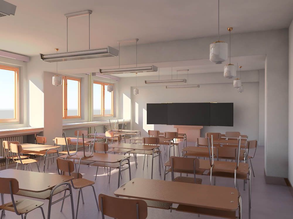 I found the classroom scene after a Google search only in Max format. Although it opens fine in Maya and comes with a few non essential geometry problems, all objects have bad or missing UVs so I had to spend about a long day fixing these to some acceptable degree.