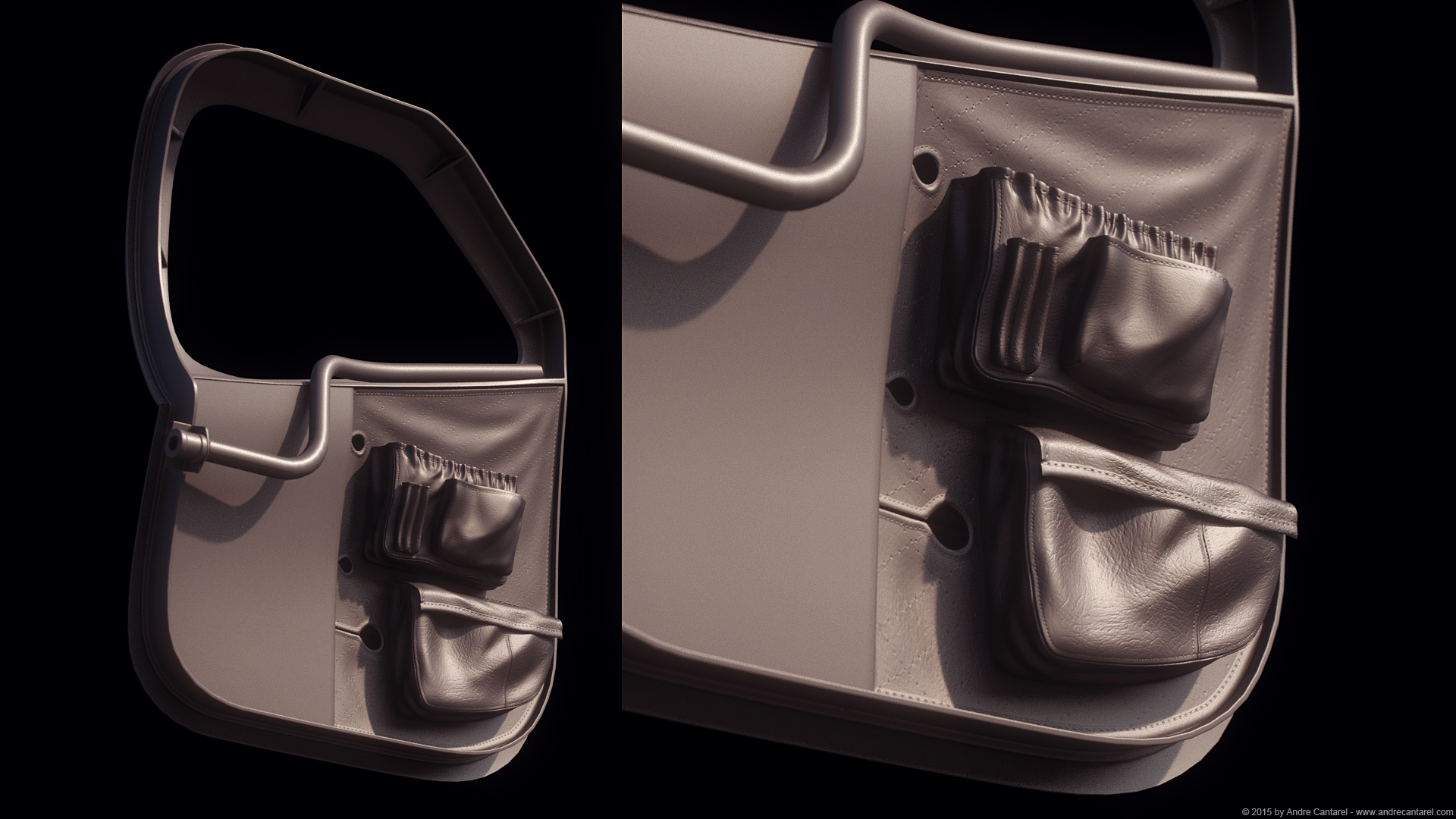 Here’s a little update. I (re)sculpted the leather part on the inside of the pilot’s door. For some reason I had a lot of zBrush crashes and some annoying distortions in the normal map when baking it out. So this here is just 1:1 the high res mesh for now.