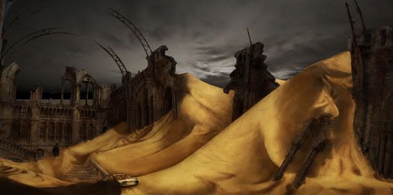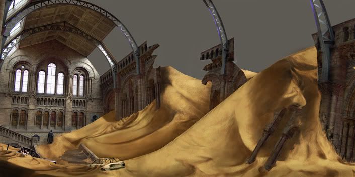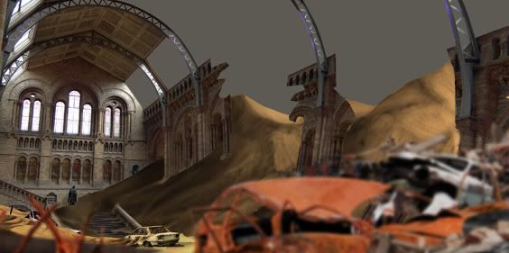 I like what you are doing, the skulls are throwing the composition out. Prehaps replace it with a arm/teddy/bear even a coke can. The skulls would look good if the rear was replicating a shallow depth of field and was out of focus. But the building unfortunately needs to be the focal point. The cars on the other hand show scale and I think you may have missed a trick with them. Id suggest looking at the cars and seeing what you can do with them. You have done a brilliant job so far and im proud of what you have done in a short space of time. Just the skulls are wrecking it for you.