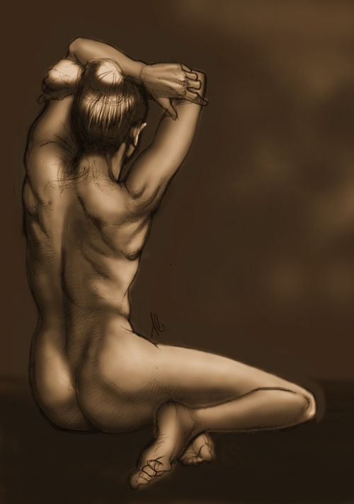 I would first start by depicting with light and shadow the collorbones and pit of the neck. Which have a sensuous “s” shaped curve and would add alot to the rhythm and elegance of the figure. (But unfortunately are not vey visible in the photo of the model.)