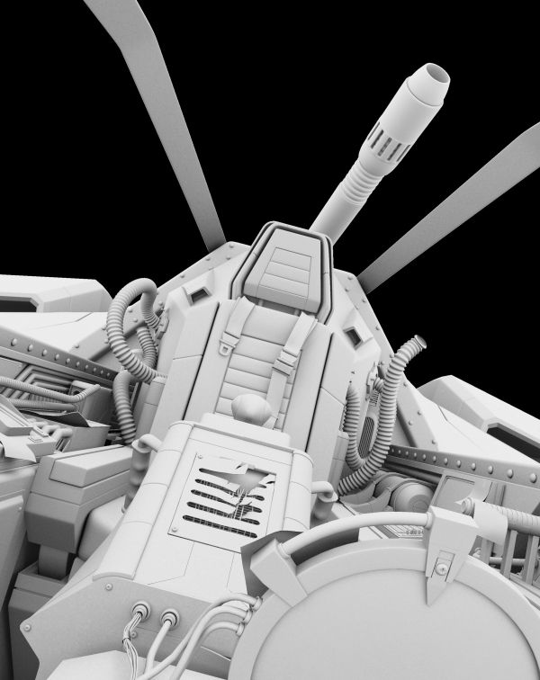 I tweaked the modeling of the cockpit a bit more. I realized that the original model had no seat belts, so I had to change most of the seat to accommodate them. I also changed the exterior of the ship and added frames for the glass. I think this works better for the composition since there are now lines pointing to the general area of where the orc’s head is going to be. I’m going to focus on texturing now.