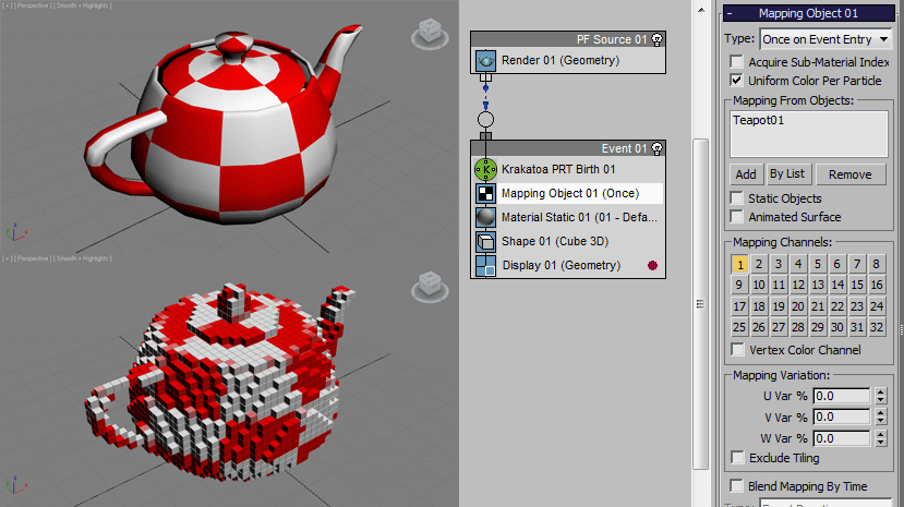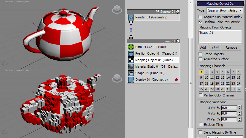 *Mapping Object operator in 3ds Max 2010 and higher, which was part of PFlow Tools Box #1 before that: