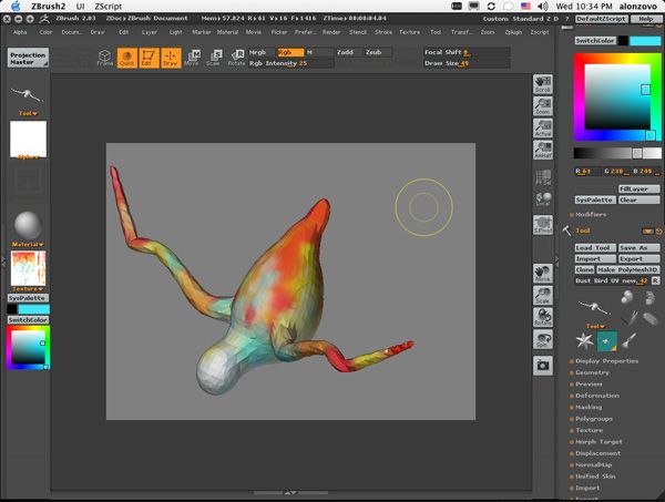 Once I have the UV’s I am bringing it into Zbrush to paint a texture interactively. This is good technique, and can help a lot so I will do all I can here. While I’m painting in ZBrush, I zapp it to Photoshop…ZBrush an Photoshop become one app. Maybe I can add more texture with PSD brushes. However, the model is a little wanky from exporting from EIAS to Maya. It’s not what I call a real model, just plug in geometry…maybe I can patch the flaws with some effect? We will see.