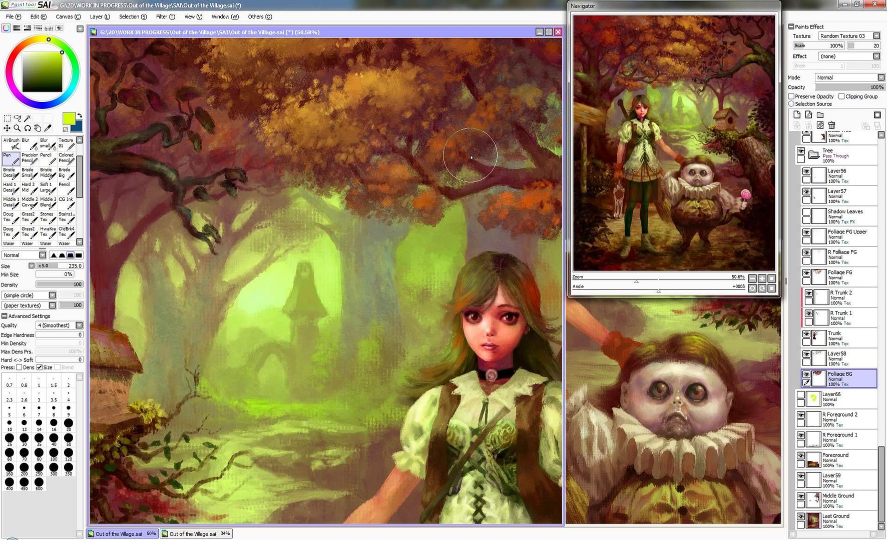 I am amazed by his work because everything is near to be perfect with only one release. Even though this image is far to be finished, there is actually 85 layers (it is not necessary to use such amount of layers but it gives me more flexibility and it does not change anything excepted of course than more memory is used) for a canvas using 4230x5346 pixels. Excepted Photoshop, no other program could use such a big file (canvas size+huge number of layers). Last time I checked sketchbook pro, a smaller file with less layers loaded forever in version 2009 and the program became unstable. In painter the navigation will slow down heavily and zooming in or zooming out will write on scratch disk because the lack of a proper memory system. Artrage will not be able to load the file or will crash just after (not tested version 3 since it is not possible to test it in real condition…thanks to developers). SAI just load the file in few seconds and the navigation is identical than using 500x500 pixels image with one layer. And every parts of the image is completely independent without hurting painterly rendering. That’s exceptional and it was possible because of reversible brushes that can add or remove paint using a simple shortcut.