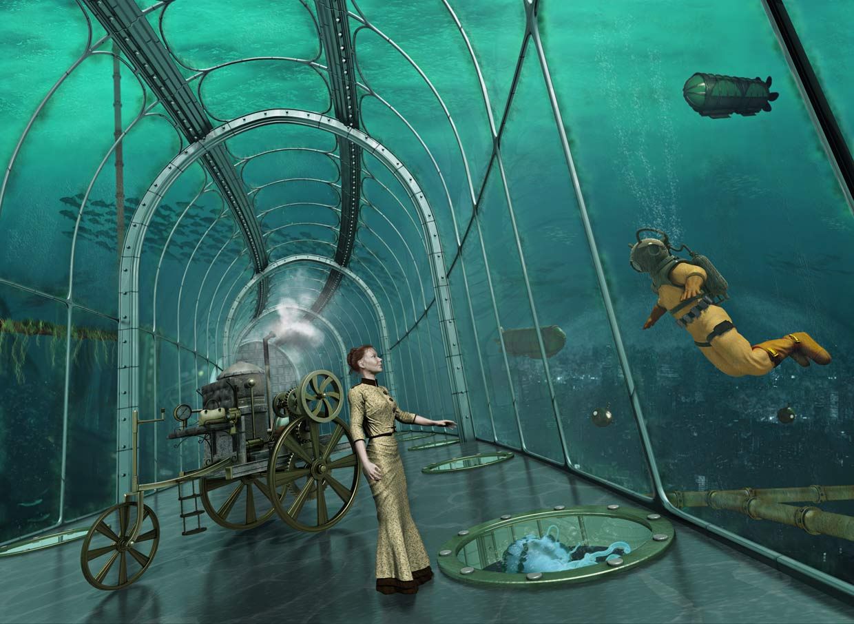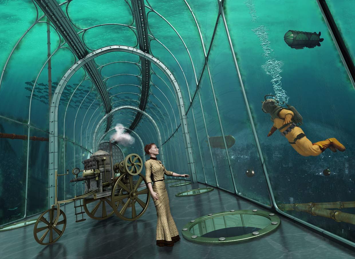 I’d push the refraction of the glass panels (at least 1.5 refraction), the underwater caustics, and some fog for the water. Bluish fog that gets bluer the farther away you get. She seems a little unbalanced in the composition. Maybe that’s the camera angle or some lens distortion.