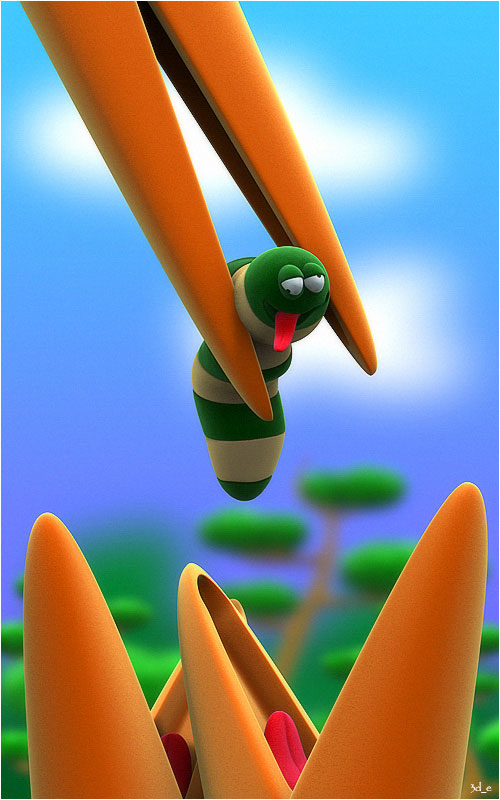 I like it. It’s original. Very simple shapes. I am not comparing you with high poly realistical staff, I would not dare. So it’s realy funny image, unhappy for the worm, but still good work.