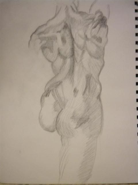 For example for the torso I first drew 3 lines to get me the angle of the shoulders, ribs and hips. Then a gesture of the back arms, leg/hips, then rough forms, I briefly layed in a rough little form of the scapulas so I knew where they were and attempted (read-failed) to try and put in the ribcage. Then I started to draw over those and outlined the basic forms, then slowly started shading. Shading is something I still don’t fully understand, I mean I can see highlights, lowlights and know to squint etc but the physical act of it has always given me problems. For now I’m trying to find my particular style for it.