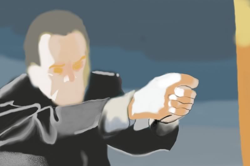 I recently started using painter and photoshop in an attempt to get back into doing art on a regular basis. I’m looking for any constructive criticism, tips, links etc. for newbs. I’ve got little to no training in 2d art (nothing beyond Highschool level intro to art), as such most of these will likely be drawn from existing things/items/stills however none of it will be tracing. I’m starting out with something simple- this is a sketch from a panel in “Transmetropolitan”. I picked it because I liked the composition and the color scheme is relatively simple. This is what I have so far…