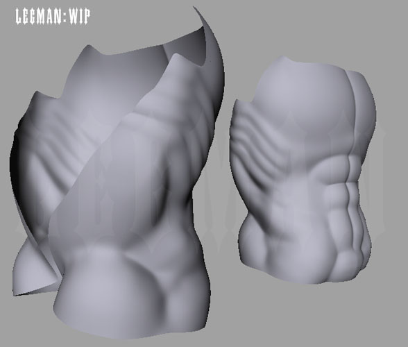 Then keeping the resulting topography in mind I start to work out patches that flow with the musculature. Then loft those into a polygonal surface.