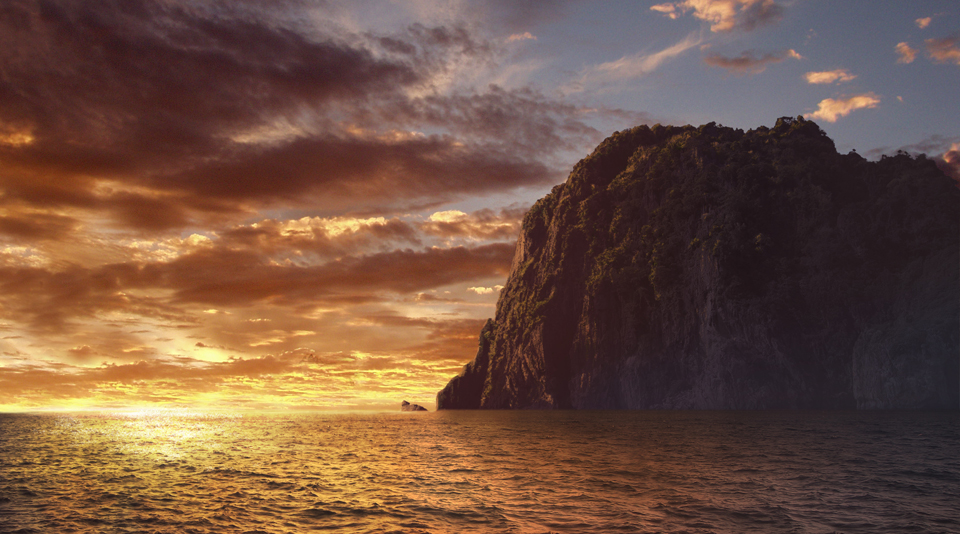 I have been an avid follower of matte painting for some time, but I am only now starting to dip my toes into this technique. This is my second attempt at a Matte Painting (not actually a true MP, since the ocean would need animating, of course). There is no actual, practical use for this image, I’m just trying to learn by doing.