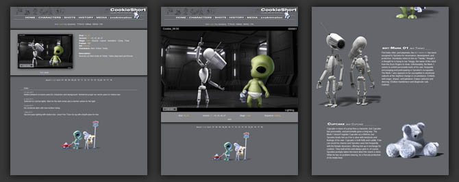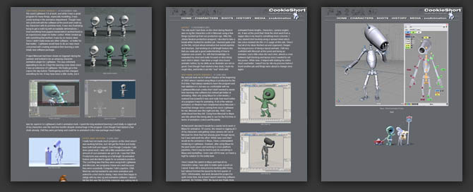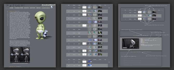 While I had finished the layout around 2004, the whole thing got put on the back burner for several years. When I finally got a bit more free time, I started an internal(local) production website to help me track my progress on a shot by shot basis with the intention of sharing this at some point. It started as a table with just text entry dates for when a shot was worked on and a blog style homepage where I write about what Ive done. It has since been fleshed out with thumbnails, media, history, etc. Each shot can be accessed and seen, different progression versions can be brought up, or stages switched such as layout, animation, comp. This has helped me see actual progress in a visual form. My short term goal was to finish scene2 to from animation to comp and then publish the current form as a wip. So, that is what Im doing now.