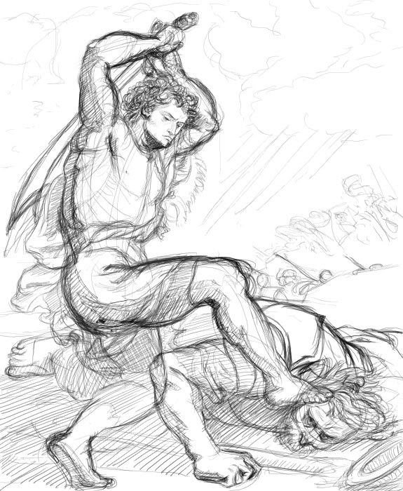 Made a few changes as you can tell. It was hard to see who was Goliath in Rubenâs version, I mean, olâ Daveâs been working out. I slimmed him down a bit and changed his pose and expression some, and yes whimped out on the background.