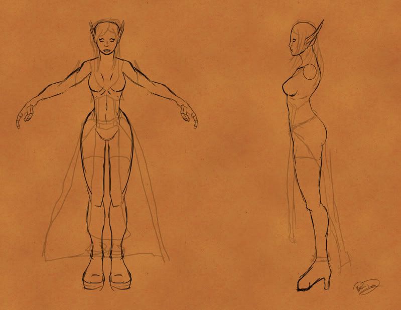 Alvina an Elf Invoker that uses a Dark/Void enchanted staff artifact. For the weapon/artifact I want it to be an old ancient weapon recently found by Alvina. And I'll also plan to have the weapon push the futuristic-ness of it. I plan to have Alvina be more traditional fantasy but the weapon to be more mechanical. Like maybe bronze made, seems inbetween future and fantasy to me. I plan to totally redesign the weapon too with moving pieces or interlocking parts. My theory behind how the weapon works is that the staff itself is a container for the purple orb. At its normal mode the staff covers/coneals most of the purple orb and in this mode it does dark magic attacks. Then in some way, like a puzzle the staff and interlock and move pieces to reveal most of the orb and in this mode it can do a void attack that like sucks thing or people into it. As for her armor they're enchanted cloth armor that has the same durability as plate armor.