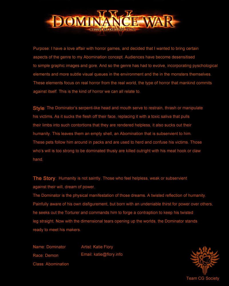 Everyone has a dark side, a part of themselves that they’re ashamed of, afraid of, or disgusted by. Humanity is not saintly. Those who feel helpless, weak, and subservient against their will, dream of power. The Dominator is the physical manifestation of every dark and twisted thought that floats through the universe, acting out the dark fantasys of those too afraid to do it for themselves. An Abomination who’s very aware of his own painful disfigurement, he seeks out the Torturer and commands him to forge a contraption to keep his twisted leg straight, so that his mobility is less hindered. Now, with the dimensional tears opening up the worlds, the Dominator stands ready to meet his makers.