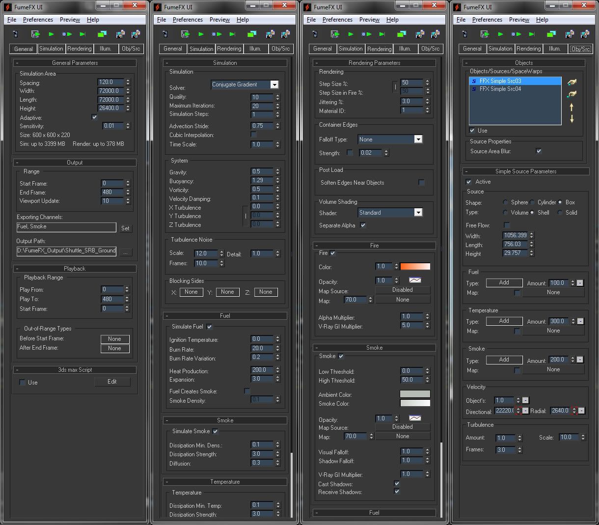 Im creating a space shuttle launch and Im having a problem getting the smoke from FumeFX to generate correctly. I have 2 sets of Sources. 2 for the Shuttle going straight up, and two for the sideways blast thats on the ground.