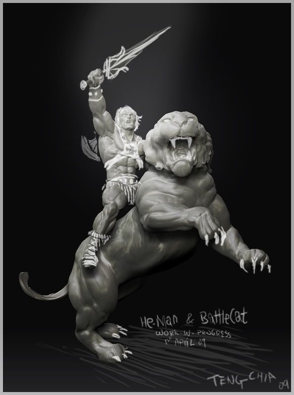 The basic idea would be He-Man in a heroic pose riding on a rearing BattleCat.