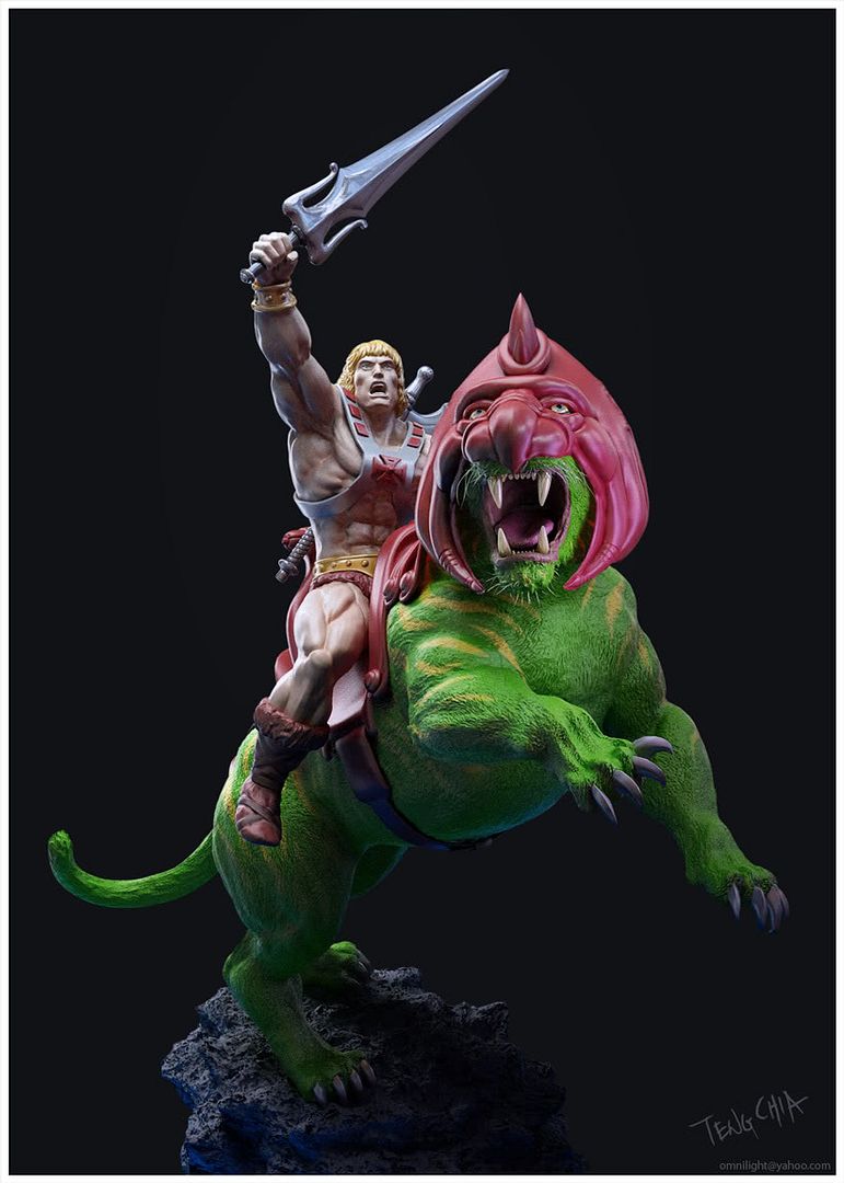 , I wanted to create a model of He-man and Battlecat in a dramatic pose, and I hope I’ve faithfully captured their essence here. I used Zbrush, 3dsMax and Vray. Spent about 90 hours total. Look for more close-ups shots in my work-in-progress thread.