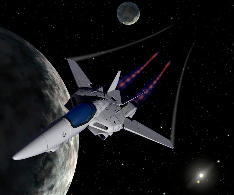 Here’s a rendering of the Valkyrie in fighter-mode. The backdrop, flares and afterburners were added in Photoshop. Background Artwork by Robert Hurt. NASA/JPL/Caltech.