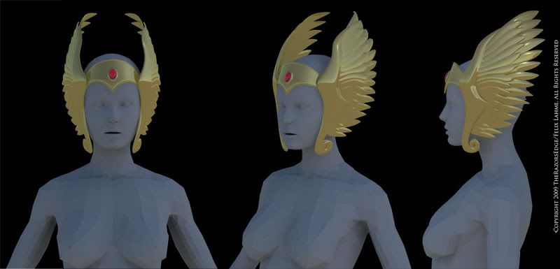 To me the wings indicate flying/streamlining and superiority through perfection of technique rather than crushing power or fierceness. I really dont want her to be visually intimidating on a martial level, but rather exude the characteristics connected with legendary kings and queens who where both wise and powerful warriors, plus have a little bit of the grace and beauty we usually associate only with angels. So the more regal look is exactly what I am going for in my model, and I’m glad it comes across as such. Thanks a lot for communicating that impression of yours, as it really helped to strengthen the concept in my head.