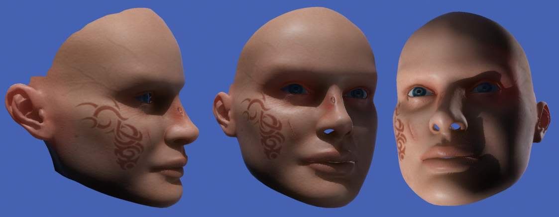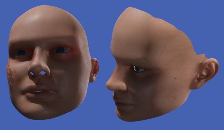 here is my final texture render, need to get onto the rest of the model now. thats using Misss, with a diffuse, epidermal, spec and bump. and a tratitional point light setup, using 3 lights. not a very expensive render. but plan to beef the render up when coming to the final piece.