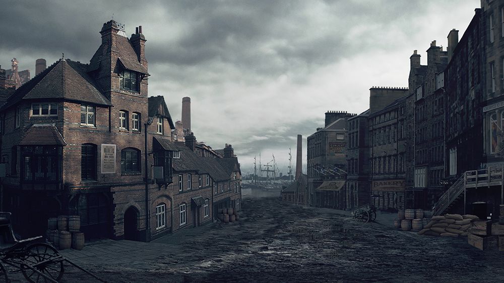 This is my Work in process, I would like to show more details from the dock, and planning some more old stylish street lamps and some shops with shade. There will be puddles on the ground too, but the cobblestones will be more visible.