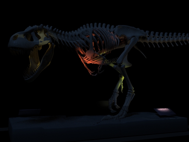 Having set up my proxy geometry for the T-Rex, I decided it would be more fun to make a picture than continuing to deal with Geometry. So, here’s my first picture. Lightwave renderer, about a 2 minute render on my Athlon64X2, using monte carlo radiosity. [Also, I like garish colors in lighting. (: ]