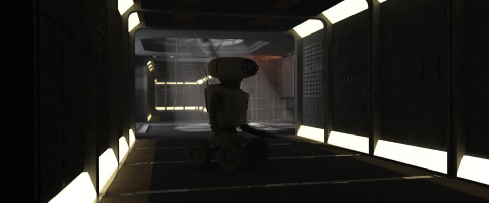 kerschyb - That’s great. There’s a problem we call “tangency” (when two things line-up too well by accident) that’s hurting the image. The white scanner-beam thing coming out of the robot lines-up too perfectly with the side wall of the hallway he’s in. If you eliminate the tangency, the whole image will read better. I wonder if we couldn’t be closer to the center of interest, too, if big parts of the bottom and right of the scene don’t have much interesting?