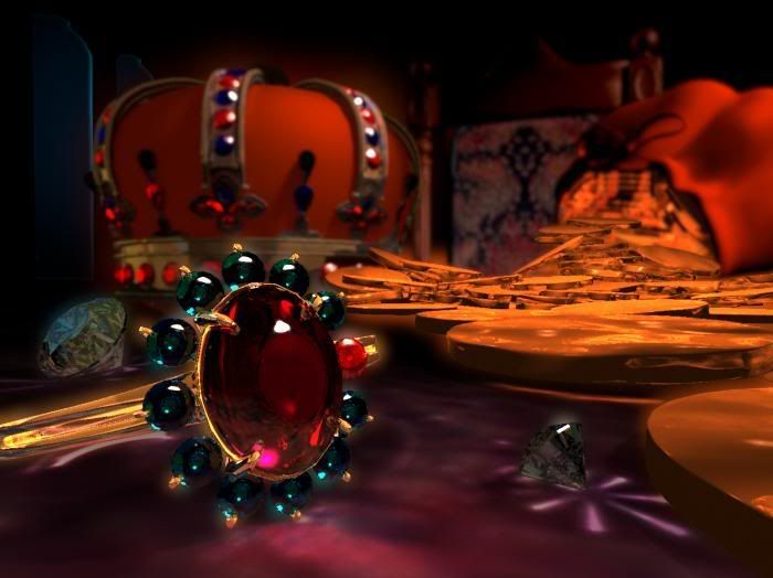 Fex - Great scene! I like how the final comp brought out the highlights in the lower right. Blurring the background object behind the crown doesn’t do much for me. The bag looks a little bit too black at the bottom, I wish it had more shaping light and texture. The sword running horizontally seems like a chance for more highlights and contrast if its gems and metal tip were played-up more. Actually, even the crown could look more vibrant if the gems set into it had some coloe and stood out boldly.