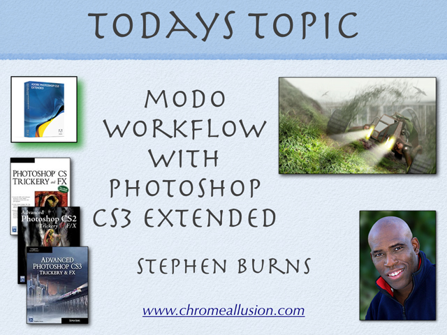 The main topic for this meeting is modo import into Photoshop CS3 Extended. Stephen Burns will present and demonstrate the workflow from modeling and painting in modo to manipulating the 3D model for 2D compositing inside the new 3D feature of Photoshop CS3 Extended. He is also a recent modo enthusiast and a member of our group.