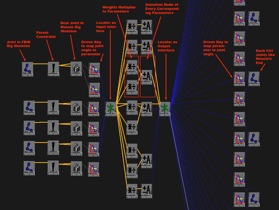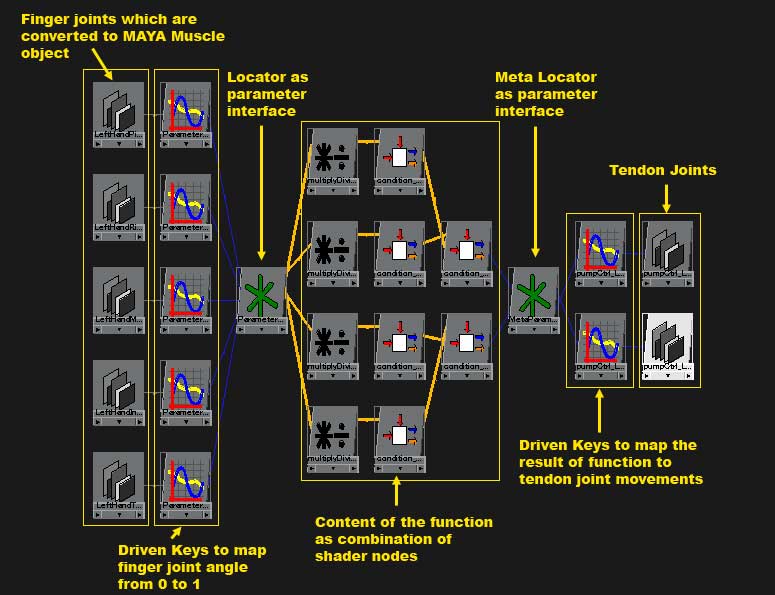 You can understand from the previous, explanating image that those finger joints(1st.) movements are mapped to the tendon joints movement throughout a âfunctionâ shader network.