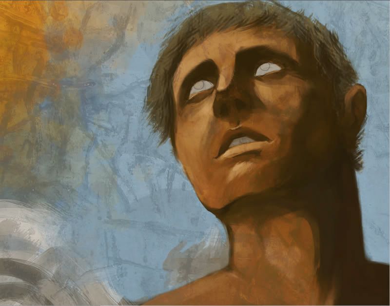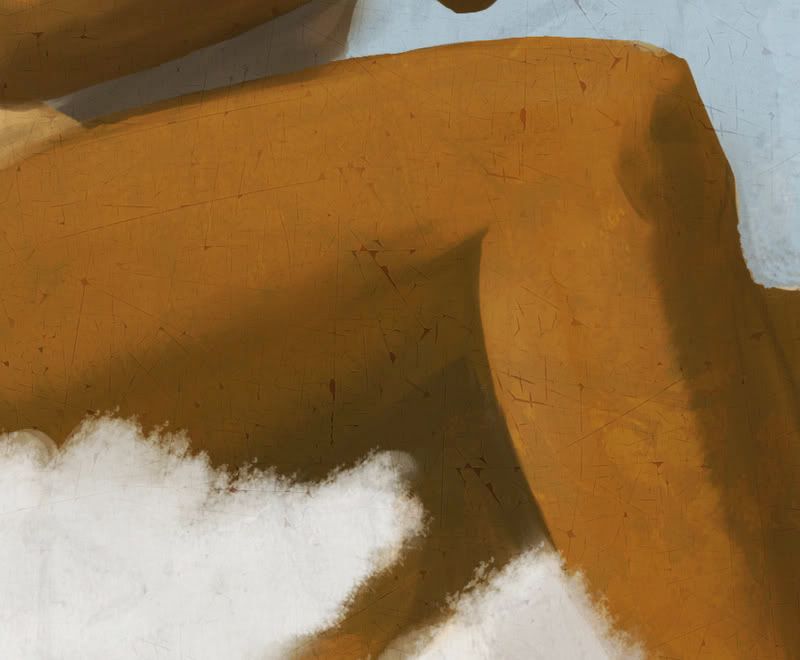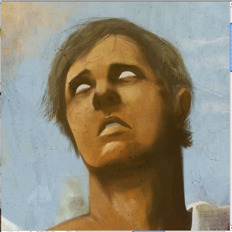 Here is a crop of the face with the texture layer at regular size (not stretched). It gives it an old, worn-out painting look that I think I’m going to try and refine in a later step of the painting. Some detailing has been done, and several anatomy fixes were made.