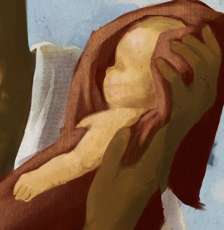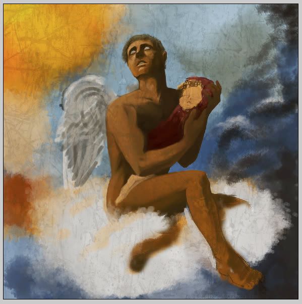 First, I went to town on the angel’s anatomy and fixed a lot of errors. I’m still not happy with it, but again, there’s still more work to do, so I’m confident it will shape up by the end. I also have a texture thrown over it on layer mode>linear burn. The texture is stretched quite a bit to cover the whole painting because of the color and contrast changes it provides, so keep in mind these large gashes will not be in the final piece. Here it is: