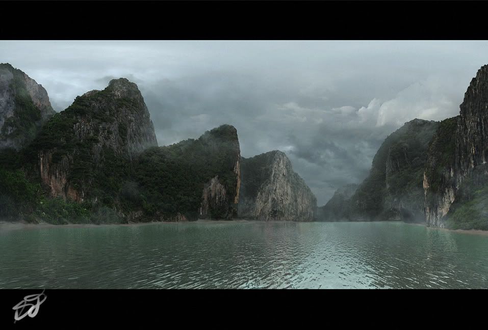 The water is going to be 3d sim, thats what I used in the painting but a still render of it. Simple water bump and I used simple geomtry for the terrian so it would get a true reflection. So All I have to do now is really camera project it more accuratly then render out the water as well.