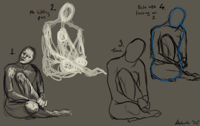 In response to your question about the “sweeping gesture curve” ~ it just kind of depends. I think that the #1 sweeping curve that should be established is the central axis of the body ~ granted, it may not ALWAYS be curved - eg, the figure is standing straight - but a straight pose is typically pretty boring. I think the head should be established first, then the central axis of the body as defined by the points connecting the pit of the neck down the sternum and rigcage, through the belly button, to the base of the pelvis. It’s the contrast of curves and angles in a gesture drawing that make it interesting, as well as the unity achieved in a good one by OTHER sweeping, gesture curves which defined the outline of the body like you mention.