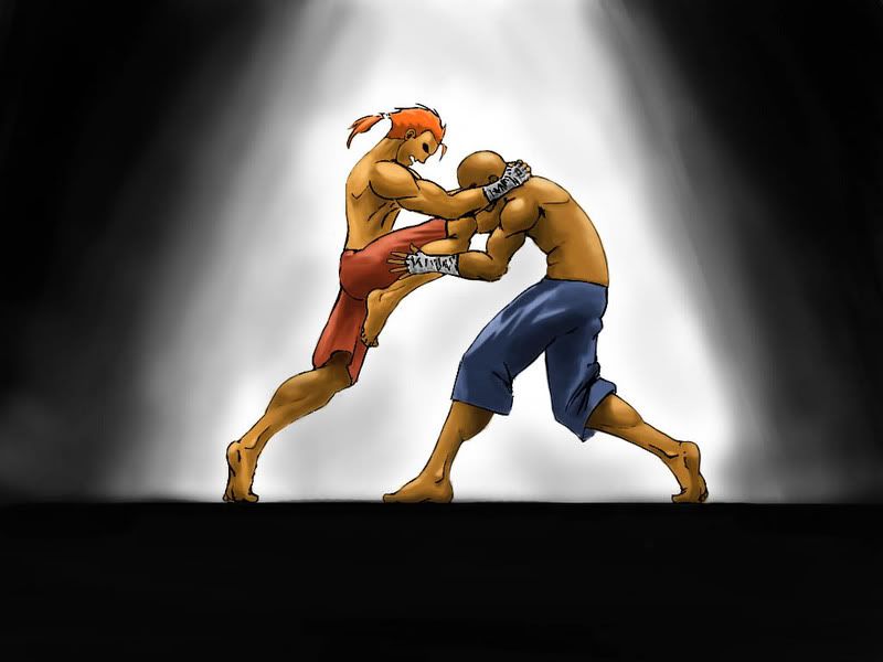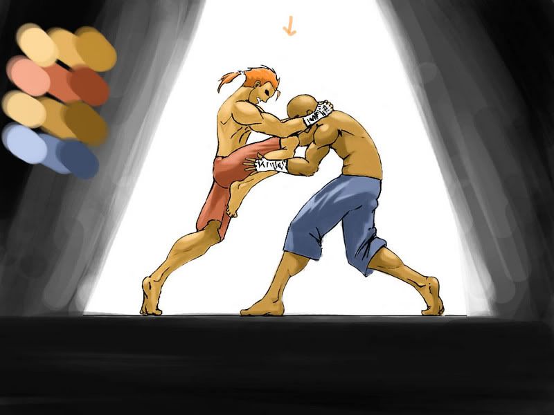 hello everyone.this time i need some help .im makin this muay thai idea i thot of when spirit dreamer advised me to try a compostion with more then one person.its stil incomplete and i’l appriciate all the paintovers and tips i can get