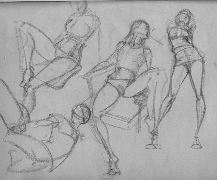 I have this great example of gestures for you. If you have laptop you could take it to the life drawing session and be a geek. Take a look HERE. Sorry, I don’t remember the artist of these, it’s among thousands of other pieces I have saved on my hard drive.